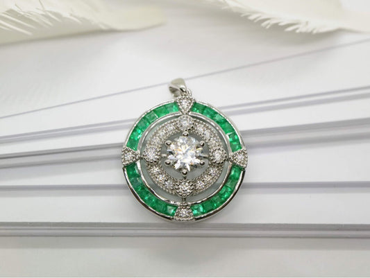 18k white gold natural emerald halo pendent, Vintage emerald diamond pendent, Anniversary gifts