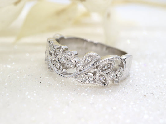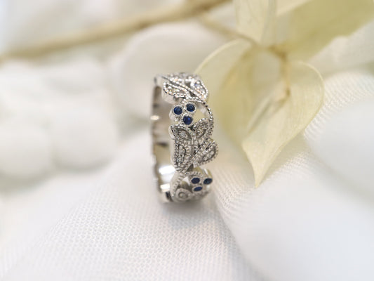 14k Vine and leaf white gold diamond ring , Filigree diamond ring, natural inspired round sapphire and diamond vine band