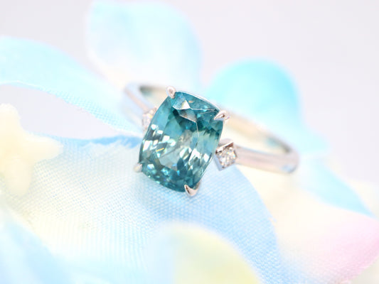 14k white gold engagement ring, Natural zircon engagement ring, Three stone ring, blue gemstone engagement ring