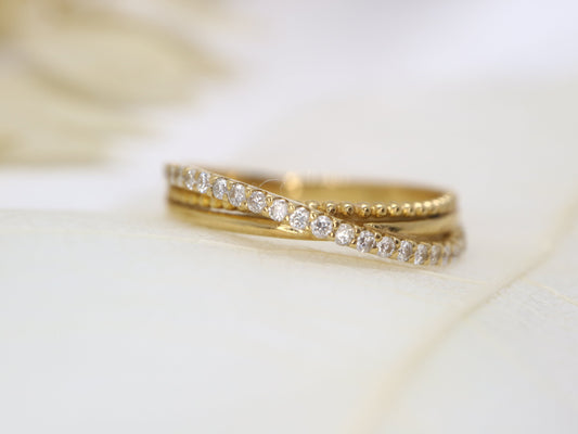 18k triple cross over diamond band, Natural diamond cross three rings, One simple row diamond stacking slim ring, Anniversary ring