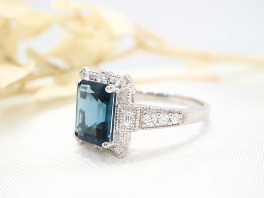 14k white gold Art Deco blue topaz and diamond ring, Engagement ring, Engagement and wedding ring