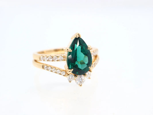 14k gold pear emerald engagement ring, Emerald engagement ring set, Wedding ring set, Anniversary ring set, Emerald bridal ring