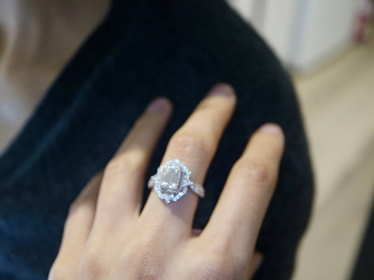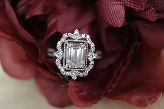 2ct Emerald cut moissanite engagement ring in 14 solid white gold-Art Deco cocktail ring, Diamond halo ring, Anniversary gifts