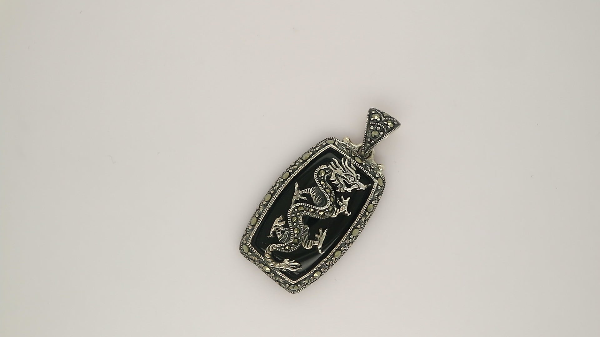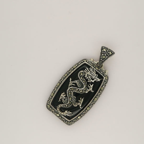 Dragon Pendant Necklace with Marcasite and Sterling Silver with choice of Green Jade or Onyx backgro