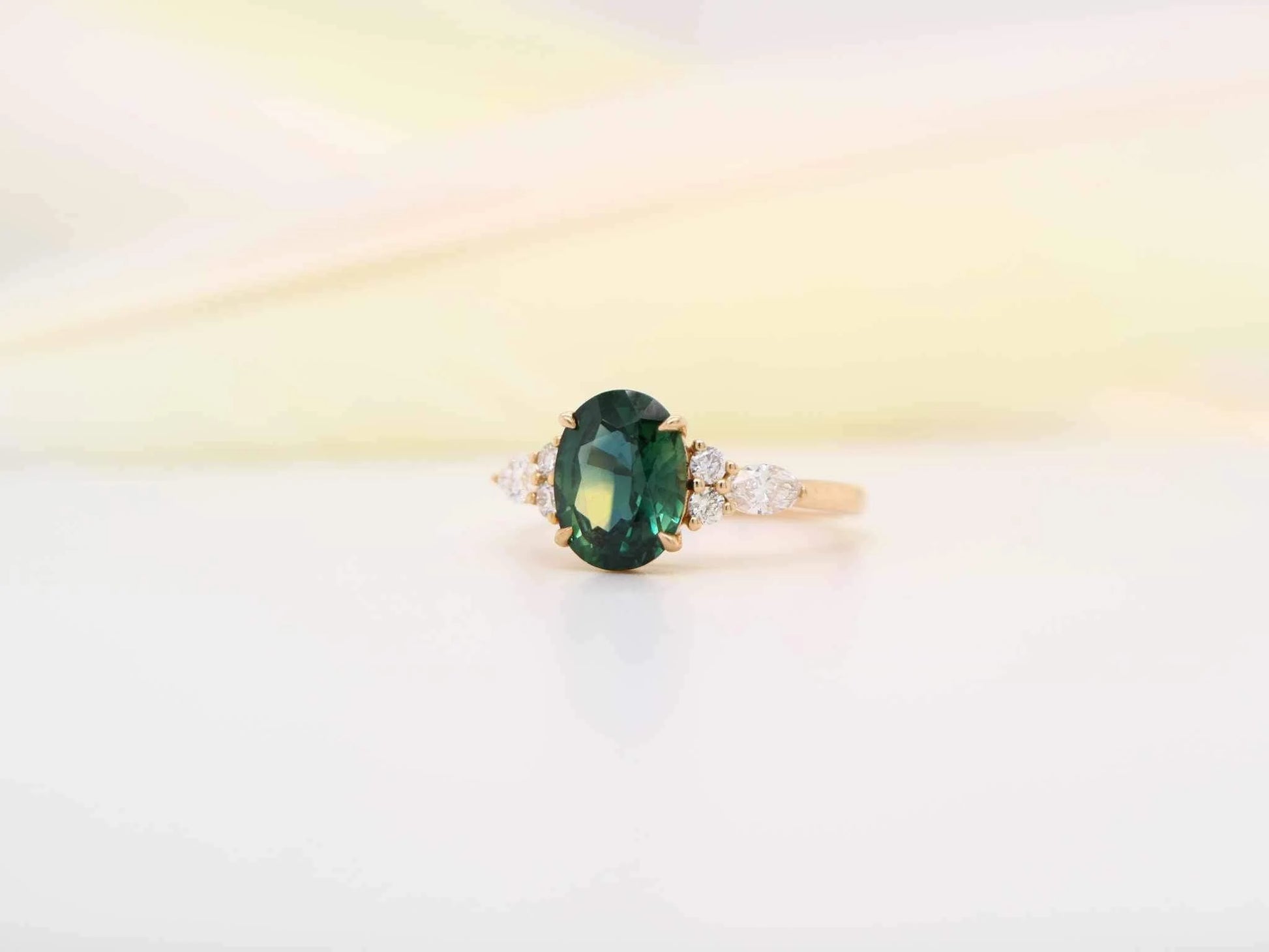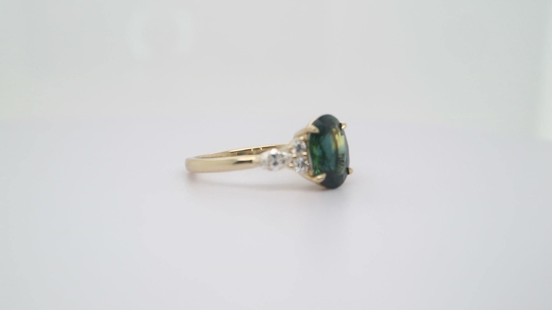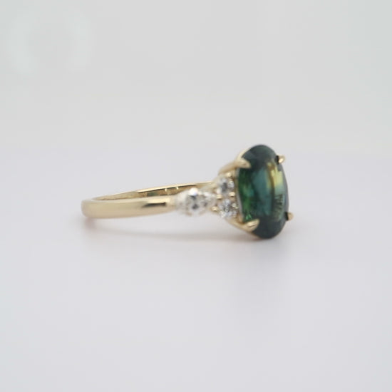 Yellow gold sapphire and diamond ring, oval cut natural parti-sapphire ring, bulish green sapphire engagement ring