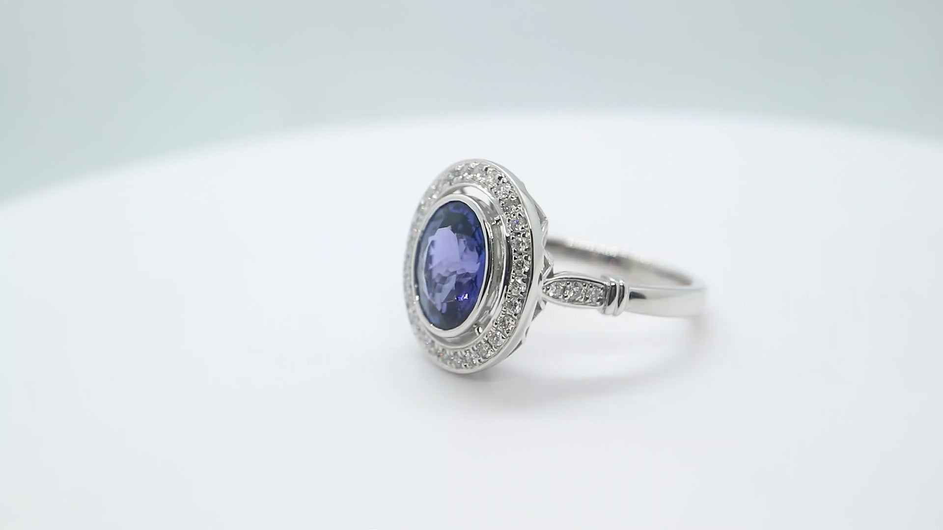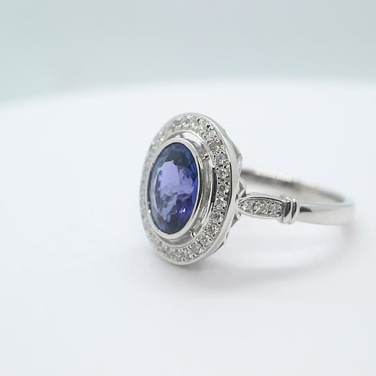 Tanzanite vintage halo ring in 18k white gold, Art deco style diamond ring with tanzanite
