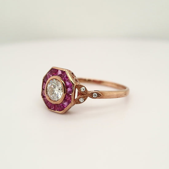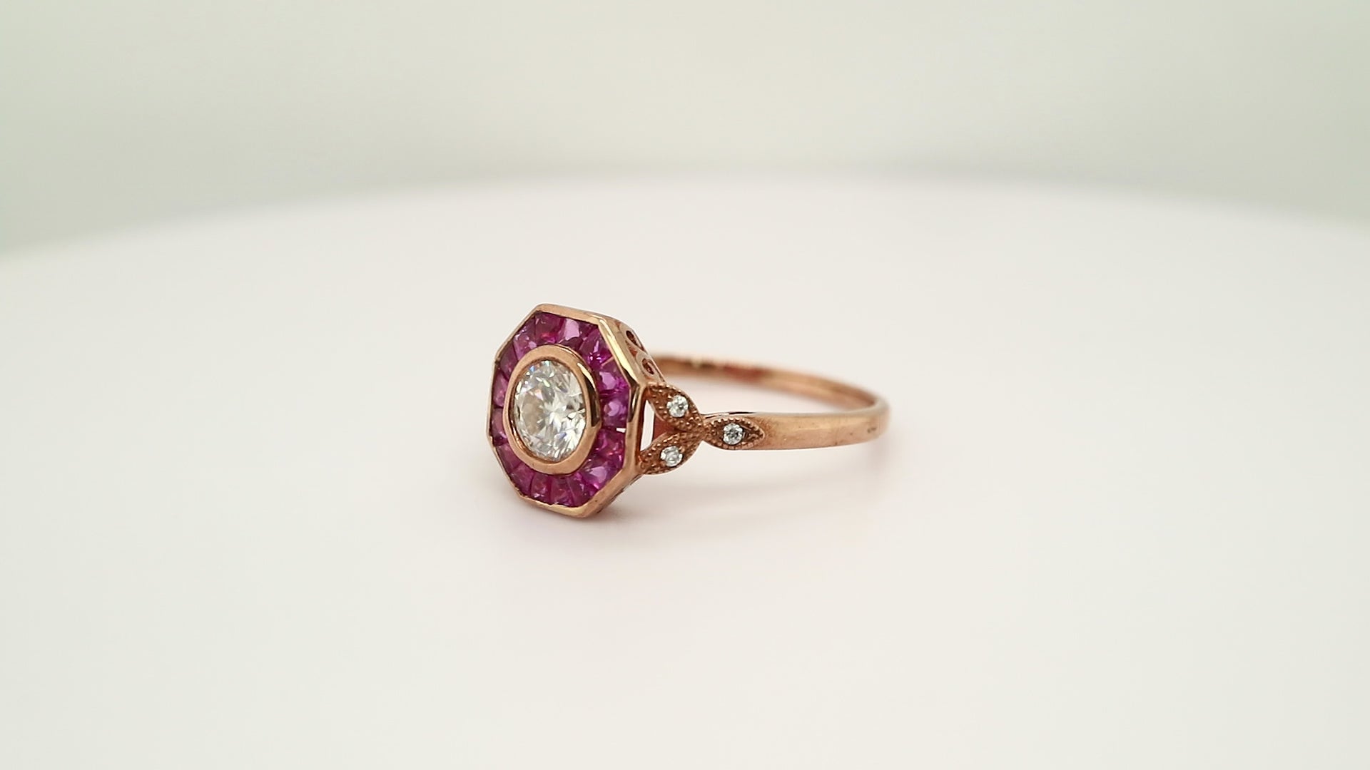 Target ring with Channel set Sapphires and Moissanite in Rose Gold